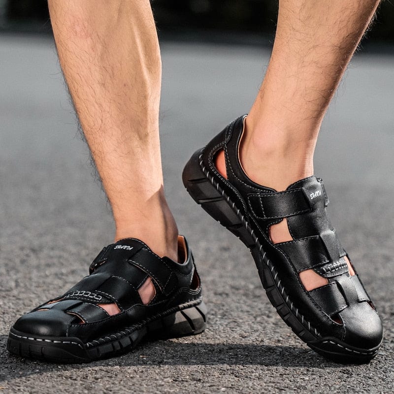 Confeccionado em couro natural, a Sandália Masculina Casual Antiderrapante oferece elegância para caminhar com conforto.