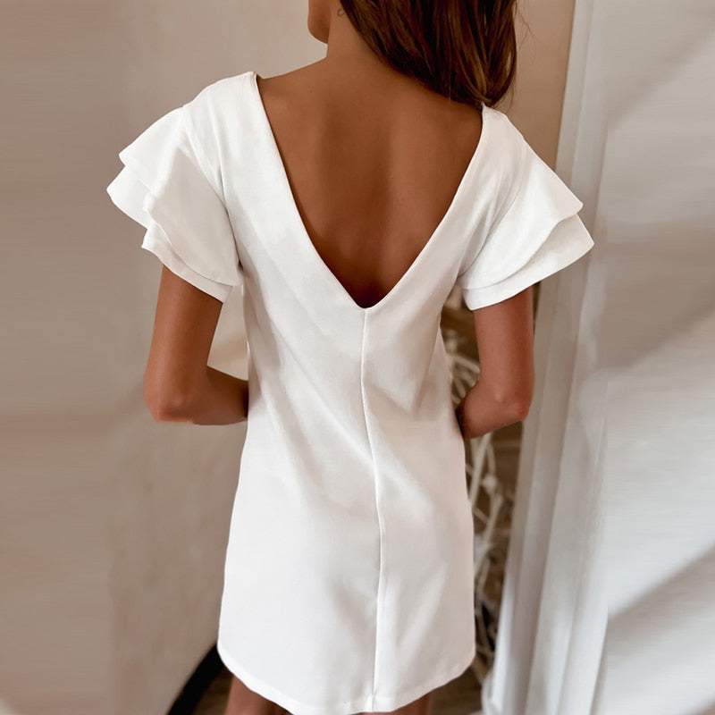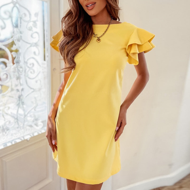 Vestido curto. Manga com babados. Decote nas costas. Cores variadas. Material: Algodão e Poliéster.TABELA DE MEDIDAS (em cm)